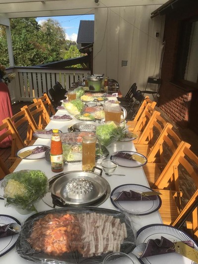 Nu har vi fått prova på grillning på Thailändskt vis. Smakar gudomligt och det blir lite som när man äter fondue. Man har att pyssla med och fixa under måltidens gång. Vi kunde alla sitta till bords och grilla och tillaga de grönsaker vi själva önskade äta.
