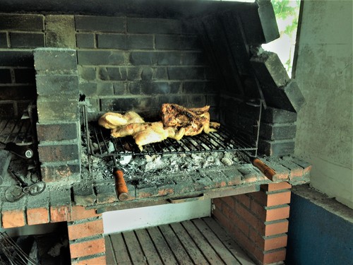 Då bokstavligen sög hon tag i oss, hon ville att vi skulle gå till hennes place och inte konkurrentens. Så vi följde hennes uppmanande gester och blev hänvisade in vid ett litet bord inne i en mörk lokal. Ett par ensamma bord ekade där, och den enda förutom vi som satt där var en gammal man med Parkinson. Han skakade och drack rödvin. Uppe på en byrå stod en gammal tjock-tv och surrade. Den visade nyheter, mest om eldsvådorna som härjar här. Och utanför den enkla plåtdörren som stod öppen, så fanns en kolgrill. Grillen var inte mer avancerad än vad någon skulle haft i sin trädgård hemma, ett hemmabygge typ. Och på gallret låg två kycklingar och fräste. Det doftade gudomligt.