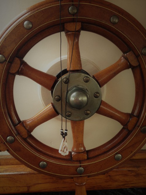 Och det är inte alla som har en ratt i köket. Snyggt tycker vi. Med mindre saker att vårda och med oförskämt mycket tid till förfogande så har vi här hunnit laga Styrman Pimpstens halsband (det hänger på ratten på bilden). Bandet gick av efter närmare tio års dagligt dinglande om halsen. Pärlorna studsade runt på gatan utanför hamnkontoret i Gijon i Spanien i somras. Nu har det inhandlats ett tunt lädersnöre och åter pryder snäckan Pimpstens hals.