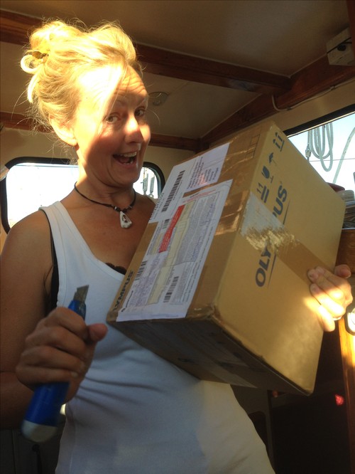 Vi drack upp vårt te lite hastigare än annars, slängde på oss kläderna och Kapten gick ut och hämtade lådan som snällt väntade på babords sida av däcket. Han bar in det och drog fram sin Biltema-kniv för att skära tejpen i skarvarna.