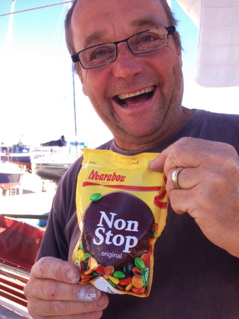 Det är så att varje gång vi besöker Nicanders Båtvarv i Lysekil och vi knallar upp på deras kontor. Så ligger där alltid godisar i en skål. Och Kapten ombord på Wilma är lite svag för dessa. Så det brukar slinka ner ett par stycken i munnen på kapten. Kanske en tredje också när Christina vänder ryggen till (jo jo..nu kommer det fram Christina…våga aldrig vänd dig om mot kopiatorn igen).