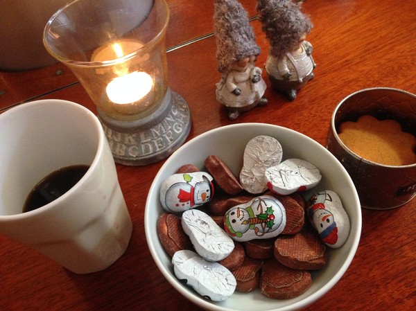 Vi hade lite adventsfika ombord. Väldigt enkelt men minst lika mysigt. Och vi hade sällskap av två små tomtar. De bor inte på loftet, utan i förvaringsutrymmet i bordet. Nu hade vi lyft på locket så de fick komma fram.