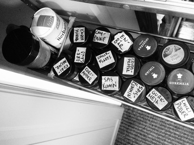 På något sätt så passerar dagarna väldigt fort, vi har kommit in i en vardagslunk här på varvet. Efter flera dagar av materiellt kaos ombord (jo byt motor i din båt så får du se hur rörigt det blir) så har vi nu börjat kunna röja och städa. Längtan efter ordning var uppenbar. Så till och med kryddorna blev sorterade och namnade. På burkarna ser man inte innehållet från ovan, så nu pryds kryddburkarna med en liten förklarande text på sin hjässa.