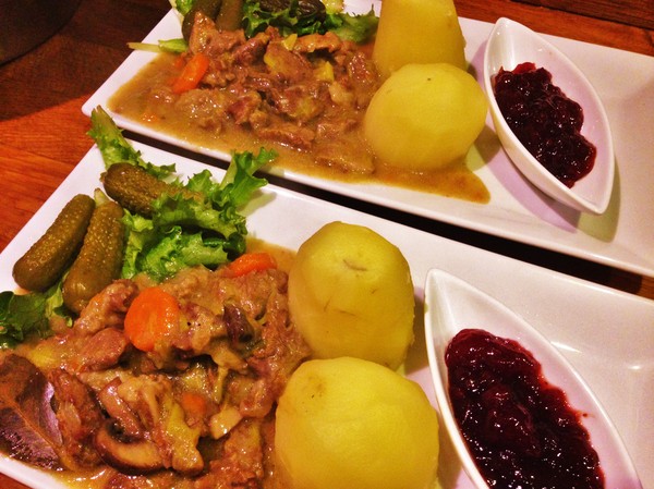 Så det blev ned i grytan med köttbenen och i med lagerblad, lök och morötter och duktigt med kryddor. Och så blev det buljongkok i två och en halv timme. Den avsilade buljongen blev därefter basen till en gryta som åts med lingonsylt och saltgurka…jo jo…sämre hundmat finns allt.