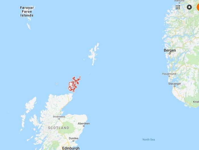Hit vill vi segla någon gång…Orkneyöarna är det litet röda klustret på kartan. Ovanför ligger Shetlandsöarna…Färöarna till vänster och till höger ligger Norge…