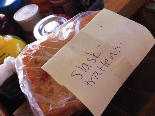 Pimpsten är ju noga att inte kasta några rester idag heller, fast hon inte lever på en bondgård. Men hon har upptäckt att det fungerar (nästan) lika effektivt ändå. Mat som behöver ätas upp lite raskare för att det inte ska bli skämt, lägger hon fram synligt och ibland även med en lapp på. Och strax därefter så är dessa leftovers ett minne blott. Som häromdagen där Pimpsten fann den fruktkaka som hon släpat runt på en längre tid. Hon fann den inte särskilt god. Om det inte vore för allt socker i den (eller konserveringsmedel) så hade den nog varit möglig och oätlig vid det här laget. Nu gjorde hon slag i saken då hon ville bli av med den. Istället för att öppna under diskbänken och slänga kak-jäkeln så skrev hon en post-it-lapp. SLASKTRATTEN skev hon på lappen. Och hux flux så var kakan väck!