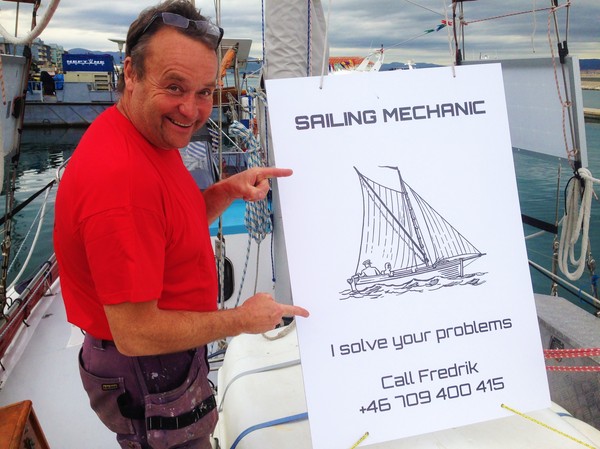Sen försvann den frusne Marcus och Kapten fortsatte med sitt arbete att fixa en hoppi-land-planka i fören (för att minska risken för ofrivilligt dopp när vi ska i land). Snart kom nytt folk förbi. Och denna gång var det för att dessa hade läst Kaptens skylt som han satt upp. Den som förkunnar att Kapten är en seglande mekaniker.