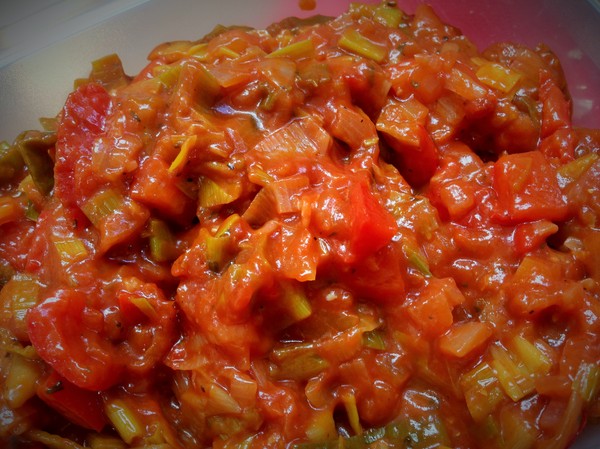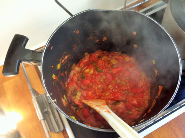 Under tiden röra puttrade så rensade och sorterade Styrman i linneskåpet… Grönsaker, en burk krossade tomater, vitlök, timjan, peppar, ev buljongtärning och salt efter behag. Och om man inte är rädd för socker så kan man ha i ett uns av mangochutney eller ett sprut med ketchup i (styrman slår dessutom i några droppar vinäger för att få upp syran…smaksak).