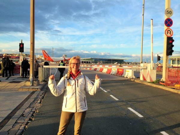 Vi lämnar Gibraltar för ett kvällsäventyr…här står vi mitt på landningsbanan. Flygplasen korsas av bil- och gångvägen som går mellan Spanien och Gibraltar.