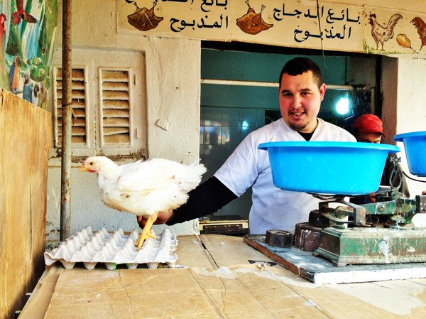 Ruffig plats, men vackert. Exotiskt. Det känns lite udda att man kan köpa sig en stor kyckling levande. Som de sen slaktar åt dig och du får den pinfärsk hem till grytan. I våra ögon låter det makabert. Men vi får ju inte tro att kycklingfilé i plastförpackning på ICA har varit något annat än en fågel det med. Fördelen här är att du faktiskt själv kan se hur din pippi ser ut. Att den ser frisk och fin ut. Dessutom så är detta sätt sannolikt mer humant utifrån djurens välmående. Det gick inte alls så många fåglar i varje bur, de hade mat och vatten och de såg ut att trivas. Kunden fick peka på vilken fågel han önskade köpa. Killen plockade då upp fågeln och vägde den. För att sen ta med sig pippin in i slaktrummet. En liten stund senare så får kunden sin fågel färdig för tillagning.