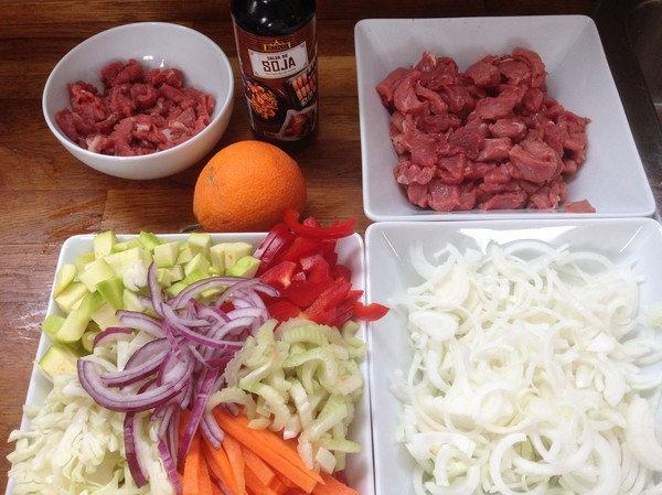 Förberett för gulash och wok…När vi ändå köper kött så ser vi till att det blir till flera middagar. Och wok är ju perfekt där vi får snurr på alla grönsaker ombord. Vitkål och morötter är basen. Här med paprika, rödlök, squash och stjälkselleri. Inget får förfaras…(superenkel woksås; pressad apelsin, soya och vatten…hoppar redning med arrowroot).