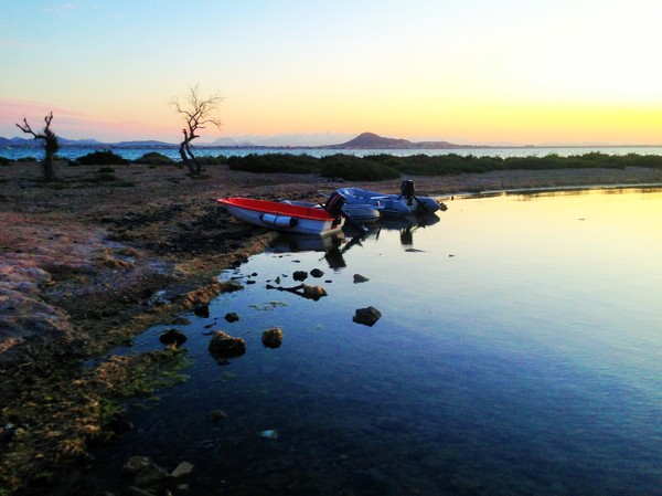 Vinden ska vrida sig nordostlig. Och vi valde därför att flytta på oss redan kvällen innan vindvridningen, för att ha jobbet gjort och få en ny miljö och utsikt. Det blev att runda den lilla ön i Mar Menor. Ön ser ut som en boomerang med en svacka mitt på. Hade svackan varit ännu lägre så hade denna ö varit två till antal, för den låglänta delen är inte mer än någon halv meter hög.