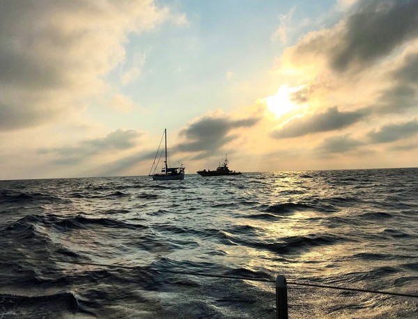 At that collision, three men threw themselves in desperation for something at Wilma to get hold of. One man got up, while the two other men fell into the black water, just as their boat was flung with force from Wilma’s hard concrete hull. The two men in the water soon disappeared behind us while Wilma sailed on with full sails and the autopilot engaged. The little boat disappeared as well, and we stood now with a scared man on our boat, two men in the sea and a handful of men in a dinghy.