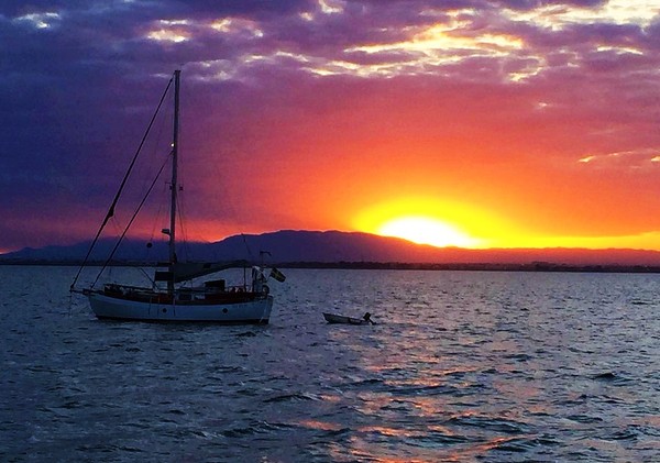 En bit mat. Lite streamad tv. Svensk tv. Vi gillar nog Sverige mer nu när vi inte är där. Vi har sett att det är soligt och varmt i Svedala och att det prunkar och blommar i var mans trädgård. Sen blev en kopp te i sittbrunnen till solnedgången. Vad vi inte visste var att vännerna på S/Y Goodvibes, som också hade tuffat runt ön för en bättre plats, hade fotograferat Wilma. Från deras position så fick de samma vackra solnedgång som vi. Men med skillnaden att de hade Wilma i förgrunden. De skickade över den nytagna bilden på Wilma och solen. Och WOW säger vi bara. Är det så det ser ut där vi är. Vi bor ju i paradiset.