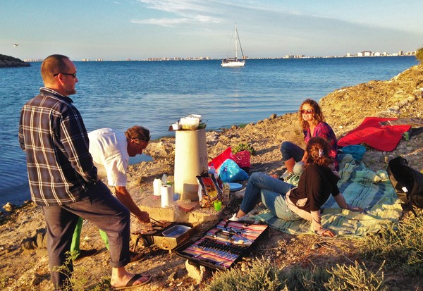 Vi båtar som gjort sällskap från Mar Menor var åter samlade och vi fick tillsammans några underbara dagar. Med promenader på ön…trevliga middagar…snorkling kring klipporna intill och en biokväll minsann. Vännerna på S/Y Goodvibes hade riggat upp ett stort lakan som de hängt över en stor solpanel. Och med denna hemmagjorda bioduk så kurade vårt gäng ihop oss i soffan och vi såg på en må-bra-film.