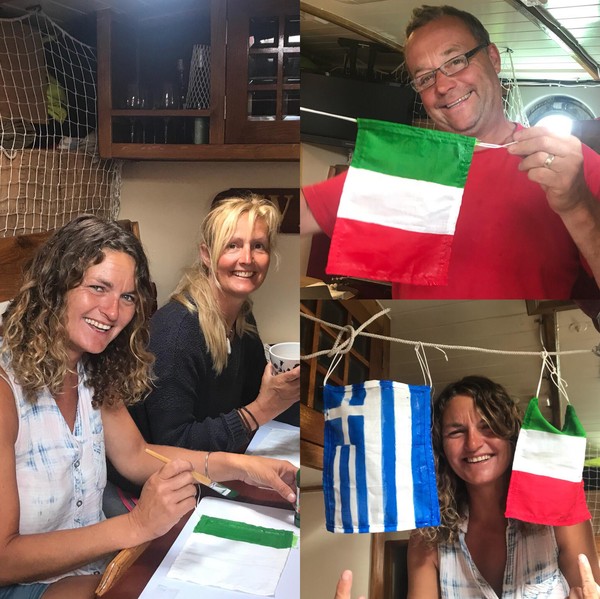 Styrman Pimpsten tog fram symaskinen. Av det vita lakanstyget så syr hon först vita neutrala flaggor. Pimpsten passade på att bjuda in Susan. Susan är en soloseglande tjej utan symaskin under huvudkudden. Hon ville väldigt gärna komma och ha en pysseldag ombord på Wilma. Hon stod såväl utan flaggor som sällskap, så vi slog två flugor på smällen.