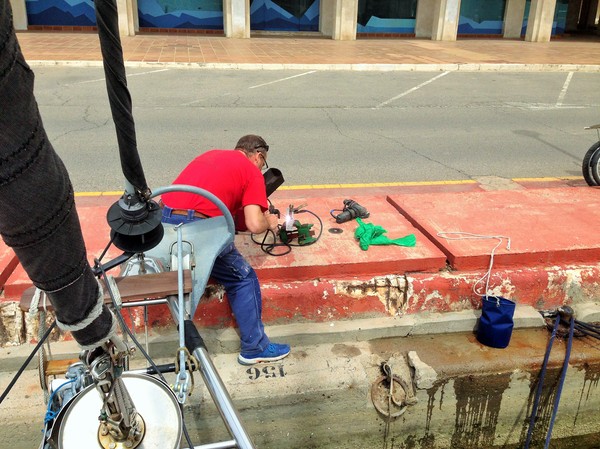 Något värt att nämna om Almerimar är hamnpriserna. Här ligger vi för 6 euro plus VAT per natt. Elen får vi betala uppå, vilket vi inte gör utan låter solpanelerna sköta jobbet. Nu laddas det ner så mycket kräm i batteribanken så Kapten om dagarna kan såväl svetsa och använda vinkelslipen utan landström. Just nu håller han på med ett litet ”projekt”. Uppfinnar-jocke är i farten och vi har anledning att återkomma längre fram.