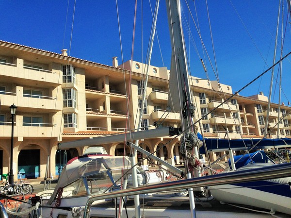 Hamnen består av flera små bassänger och vi ligger i den ”tysta” delen. Här finns inga restauranger och lägenheterna runt om står helt tomma. De har nog producerat lite för mycket, en lägenhet i Spanien kanske inte lockar folk lika mycket längre. Så det är lite öde här. Men vi har fantastiskt läge, väl skyddat och sol nästan hela dagen. På förmiddagen får vi in solen från aktern och morgonteet intas i sittbrunnen i solskenet. Nu kan vi sitta ute rätt tidigt om dagarna i bara kortärmat.