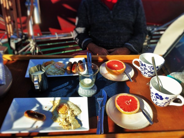 Frukoststund ombord…solen skiner varm och vi sitter länge med te och annat. Yatzy såklart och ibland tjoar Kapten lite för högt när det går bra…