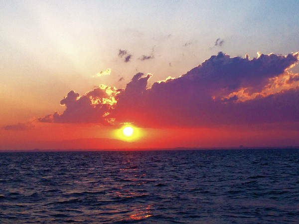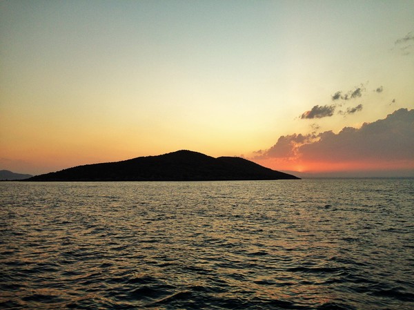 Vi sökte dock en ankringsplats bakom en av de två öarna som finns här. Det skulle ju blåsa upp framåt midnatt. Och intill den ena ön som är formad som en boomerang, så fann vi skydd på dess ena sidan. Endast en annan båt låg på svaj där i viken. En liten rackare till båt, utan någon AIS. Vi tog kikaren och kollade medan vi såg solen gå ner i horisonten och färga hela himlen röd. Den lilla segelbåten var häpnadsväckande lik vår vän Susans båt. En tjej vi träffade på Algarve och som seglar ensam. Vi tog ett varv runt den lilla båten och visst minsann. Där stod Susan på däck och vinkade till oss med ett leende från öra till öra och med hennes stora hårsvall fladdrandes i vinden.