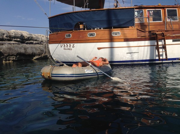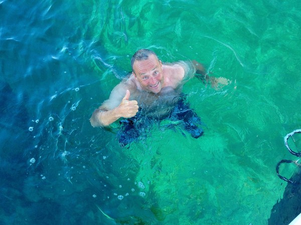 Vi gillar livet på svaj. Här, med långt mellan alla båtar, så kan vi lätt hoppa i nakna i plurret. Vattnet är klart och vi simmar runt båten och snorklar och tvättar oss. Man flyter så lätt i det salta vattnet. Simskolorna hemma i Sverige skulle ha en lätt uppgift om de åkte hit med ungarna. Som korkar skulle de flyta omkring. Det skulle ta lärarna halva tiden att få kidsen simkunniga. Inte heller skulle de stackars barnen få blå läppar eller skaka som asplöv av köld. Nä, här skulle alla vara glada och ingen skulle drunkna. Sannolikt skulle föräldrarna också gilla upplägget…barnen skulle kunna hämtas i slutet av veckan efter att mamma och pappa förvandlats till pepparkaksgubbar i den stekheta sanden och druckit förföriska drinkar i baren. Att ingen kommit på det än…