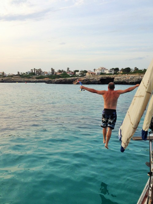 Vi är på Menorca nu. Vi ligger i en fantastisk liten söt vik på den södra sidan av Menorca, i Cala son Saura. Klarare vatten är svårt att finna och när det blir vindstilla en solig dag så skapas skuggor under båtarna. Det ser ut som båtarna svävar fram för gränsen mellan hav och himmel smälter ihop. Lite läskigt och mystiskt. Och man ser ner till botten lika bra som i ett dricksglas med vatten.