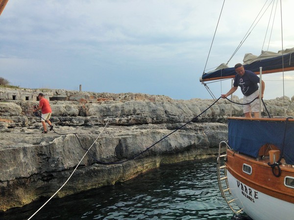 Nu kom ljudet från jollen. Beroende på väder så lägger vi jollen ibland efter oss. Eller så placerar vi den långsides parallellt med Wilmas skrov och fendrar av så den inte slår emot skrovet.