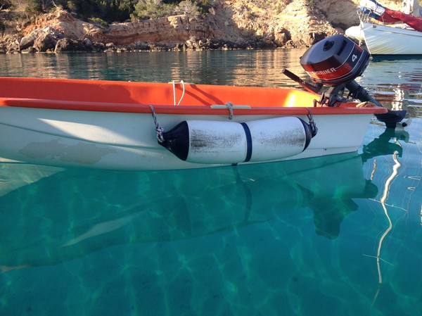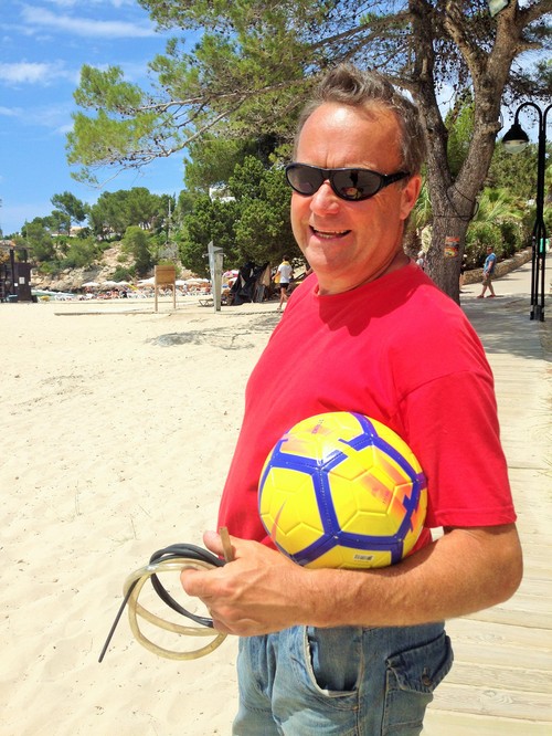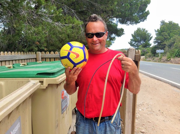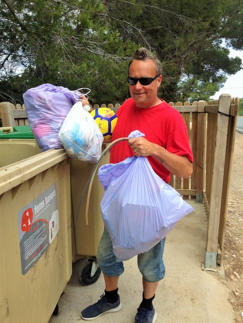 Vi promenerade därför vidare och vi började planetstäda och plocka upp en del av de plastflaskor och ölburkar vi fann längs med vår promenad bort till Portinatx. När vi kom fram till en sopstation så hade vi en hel påse full med upplockat skräp. Dessutom så hade vi hittat en fin fotboll som vi behöll. Och två fina slangar för Kapten att lägga till sitt lager i verkstan ombord.