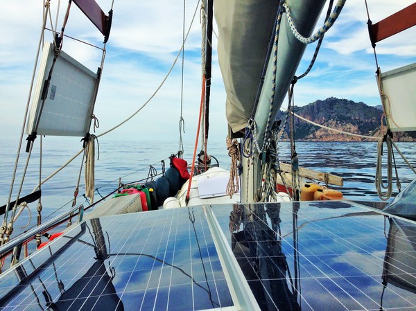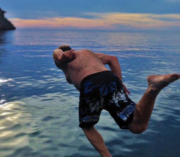 Vi bytte snabbt om och tog oss ett bad direkt. Kapten hoppade från båten men halkade vid avstampet. Han fick en sannerligen rolig färd ner mot vattnet. Styrman Pimpsten vek sig dubbelt av skratt och hann fånga hoppet på bild. Därefter så duschade vi uppe på däck. Nakna och vi hade varmvatten då vi kört motorn under dagen. Så vi kopplade en slag från kranen i byssan och upp på däck. Underbart, att stå naken på däck hade vi inte kunnat göra i Port de Sóller. Här kunde ingen, utomvis våra vänner och grannar se oss.