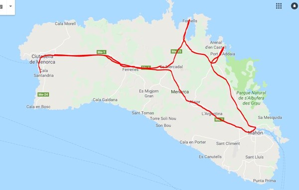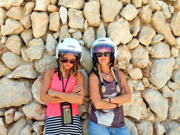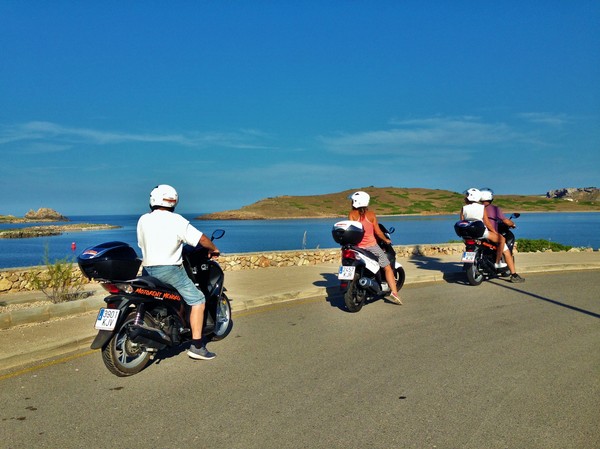 Nu tyckte vi att det var dags igen och våra vänner var precis lika sugna som vi. Sagt och gjort. Vi promenerade in till Ciutadella till en uthyrningsfirma. Och där skrev vi på för varsin 125 cc, en MC per båt. Ett glatt gäng kunde nu glida fram på de Menorcanska vägarna i dagarna två. Målet var att hinna besöka några spännande platser och se lite av landsbygden under dag ett. Samt att hinna med lite praktiskt, bunkra mat och tvätta kläder med mera under dag två.