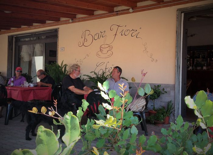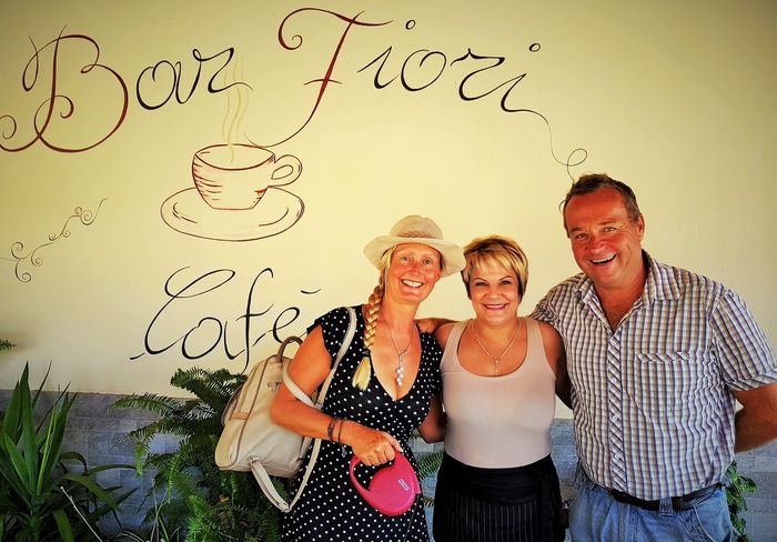 Vi tog först kustvägen ner mot staden Olbia som ligger på den östra sidan av ön. Detta för att därefter ta ut på en annan väg som skulle leda oss ner mot Nuoro och de närbelägna bergen där. Kapten vid ratten förkunnade att en sådan strapats nog krävde en kopp kaffe på vägen. Och vi andra höll med, det är ju inte bara målet som räknas med en sådan här dag, utan även vägen däremellan. När vi kommit ut på mindre vägar söder om Olbia så sladdade vi in vid ett café. Nu var vi definitivt på en plats dit inte många turister hittar, varken caféägaren eller någon gäst pratade engelska. Men det fungerade fint ändå. ”Due cornetti con marmelatta e due cappuccuni” beställde Pimpstenen åt sig själv och Kapten. Ägarinnan som var en frisk fläkt pratade glatt med oss…på italienska, men vi var alla glada och med teckenspråk därtill så gick det bra. Innan vi åkte därifrån så blev det kramkalas och uppställning för fotografering. Jo det skulle nog inte dröja länge förrän hela byn visste om det något exotiska besök från nordbor på byns café. Vi själva fick också en god eftersmak, inte bara för att den lilla marmelad-croissanten var mäkta god…utan för att tre cappuccino och två bakverk kostade enkom 5,20 euro totalt! Det är tydligen bortom turisthaken som man ska ta sig…