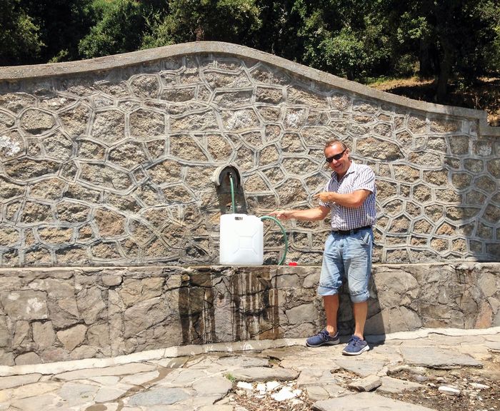 Vi fann gratis och gott källvatten uppe i bergen…Sardinien är en grön ö, kanske för att de många och höga bergen behåller vattnet som regnar och snöar över området om vintrarna. Och som sedan rinner och filtreras genom de många gruslagren utefter bergssidorna. Längs med vägarna så varnades det för snö och halka…men nu hade vi temperaturer kring 30 plusgrader så vi antog att det inte gällde denna årstiden…