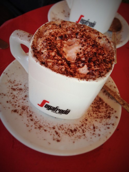 Dekorativt cappuccino med kakao strött över hela koppen. Riktigt gott kaffe!