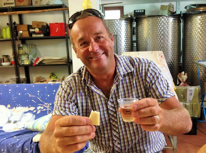 Vi blev genast mottagna med stort hjärta av en äldre man och hans kvinna som stod i köket. Ingen kunde engelska utan vi fick använda de få italienska ord vi kunde. Vi blev hänvisade fram till ett enkelt bord i husets källare. Här pågick tillverkning av ost bland annat. Den gamle mannen lät oss provsmaka gårdens vita vin, bärlikör, tre sorters ostar, korvar…våra hjärtan sjöng av lycka och vi fattade inte riktigt att vi från ena stunden ute på den dammiga vägen nu helt plötsligt satt hemma hos en sardinsk bonde och åt av hans mathantverk. Godare och mer genuint hade vi nog inte smakat förut. Vi fick en rundvisning och vi ville såklart handla med oss några av gårdens fina produkter. Ja fattas bara annat, för det sägs att det är öns pecorino-ost och vin som bidragit till att sarderna blir så rysligt gamla och vitala.