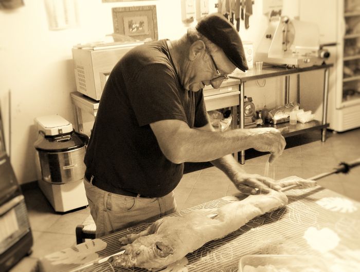 När vi kom tillbaka så höll den gamle mannen på att förbereda en porceddu, grillad spädgris. En sardinsk specialitet som kvällens gäster skulle bli bjudna på. Man måste boka bord två dagar innan för att få plats i restaurangen som låg en trappa upp i boningshuset.