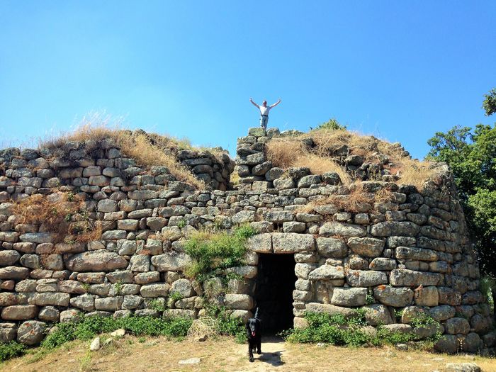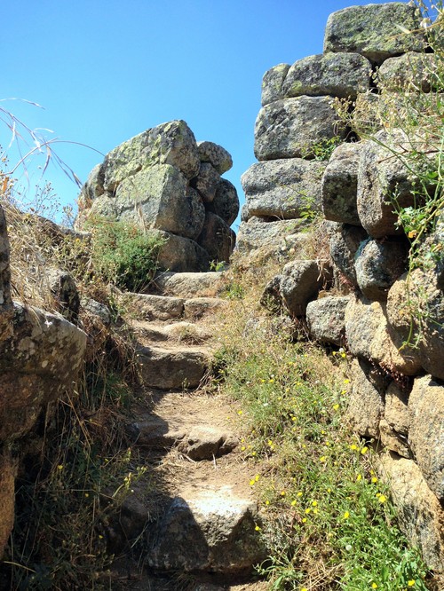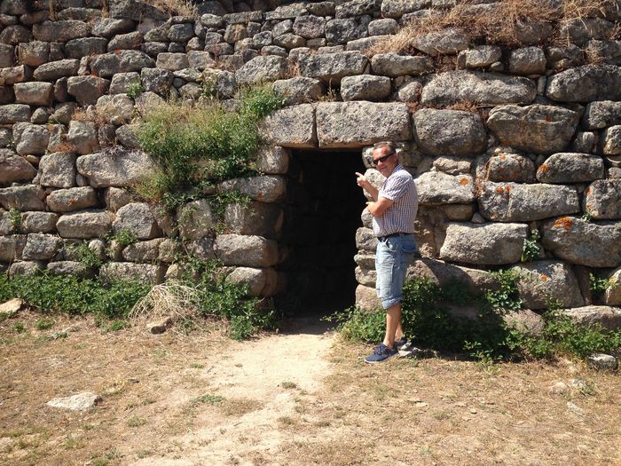 Nurager var de antika sardernas hus och nuraghe (sardinska) betyder också ”stort hus”. Byggnaderna byggdes sinnrikt och var utformade med rum och korridorer och trappor till ytterligare våningsplan. Vi stannade vid ett av öns alla Nurager och vi lät vår fyrbente vän springa fritt då vi var ensamma på platsen. Denna Nurag var från bronsåldern och uppförd kring år 1600 före kristus. Vi sprang in och upp i borgen och vi lekte i korkekslunden intill. Vi förundrades över denna vackra plats där människor här hade bott och verkat för mer än 3500 år sedan.