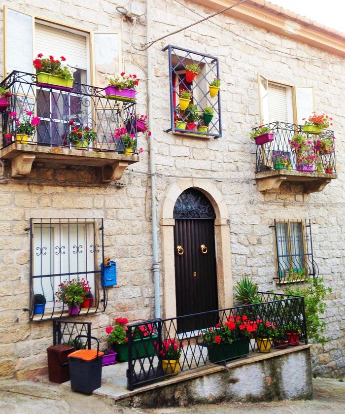 Någon har planterat vackra blommor på en balkong till ett öde hus…enormt smakfullt på något vis…