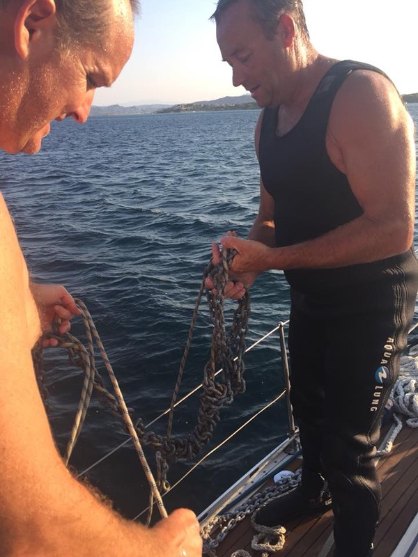 Till slut så kom Rivabåten loss och då var det bara Goodvibes galet uppsnurrade ankarkätting kvar att reda ut. Medan dykbåten bogserade Goodvibes sakta över viken så trasslades det sista ut. Därefter kunde ankare och kätting kopplas ihop på nytt och de kunde ankra om. Vännerna kunde pusta ut!