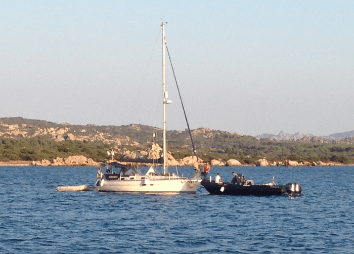 Vi slet ner seglen och startade motorn och gick kortaste och snabbaste väg mot vännerna. Vi kände oss för övrigt rätt så vana att sticka iväg på räddningsuppdrag. Nyligen så hade vi räddat ett rymmande solparasoll på stranden i Cannigione…Kapten Betong hade klättrat ner bland klipporna för att fånga tag i den. Vid återlämnandet av parasollet så hade den snopna mannen som sett sitt parasoll flyga iväg kysst Styrman Pimpsten som tack. Ja inte på munnen då, utan på handen. Han ville prompt bjuda på kaffe som tack och han berättade att han var stadens hårfrisör och klingade till namnet Sebastian. Men vi tackade snällt nej och sa att han i sin tur kan hjälpa en annan medmänniska med något. Det är roligare att lämna stafettpinnen framåt än tillbaka där den kom ifrån.