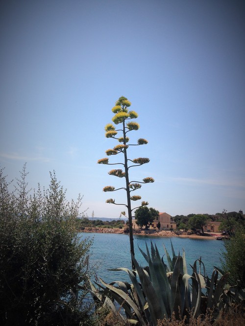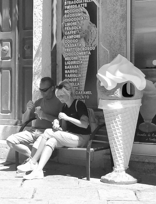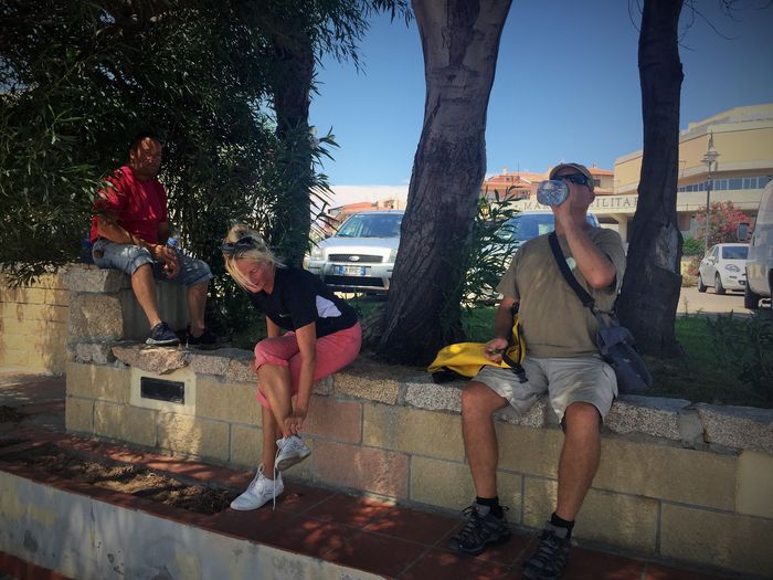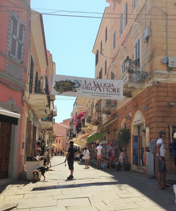 Vi har varit i land. Den varmaste dagen dessutom, 36 grader och vindstilla. Puh! Vi och vännerna tog oss in och promenerade sen tre kilometer in till byn La Maddalenas som ligger på ön La Maddalenas och som i sin tur ligger i naturreservatet La Maddalenas. Vi promenerade längs med tråkiga gator kantade av höga staket som förkunnade militärt område. Nedgånget och slitet, oromantiskt. Men väl inne i byn så rättade det till sig med charmiga gator och hus. Det blev tre strandhugg. Först en glass. Sen ett stopp för kaffe och Aqua Minerale. Sist ett besök i mataffären. Månadens sista utsvävning, plånboken stängd!