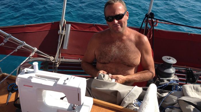Vi har inte bara roat oss. Kapten har även lagat segelkapellet. Inget är väl sexigare än en man vid en symaskin (oj nu drar Felix i Lysekil sin hand genom sitt hår och ler).
