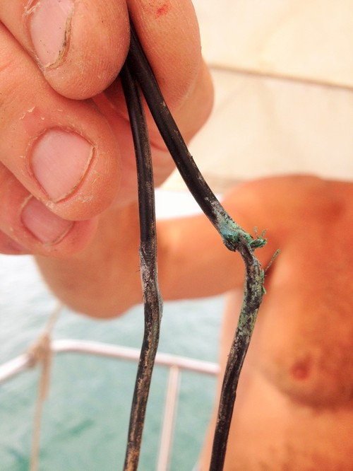 Jo, de hade velat dra den sjunkna båten till andra änden av bassängen, men att vår avspärrning förhindrade detta. Polisen hade således velat att vi skulle ta bort vår korsande förtöjning. Vi bad om ursäkt för att vi inte hört men vi sa också att det är av säkerhetsskäl som vi förtöjt som vi gjort (vi själva tänkte att kanske polisen har en batong att banka på skrovet med eller en megafon i sin bil att ropa i när dumma segelbåtsägare inte hör). På vårt påstående att vi dragit en förtöjning rakt över bassängen av säkerhetsskäl vågade han inte säga emot helt plötsligt, det fick vi lov att göra. Vårt stora brott verkade nu mest ha varit att vi inte hört…