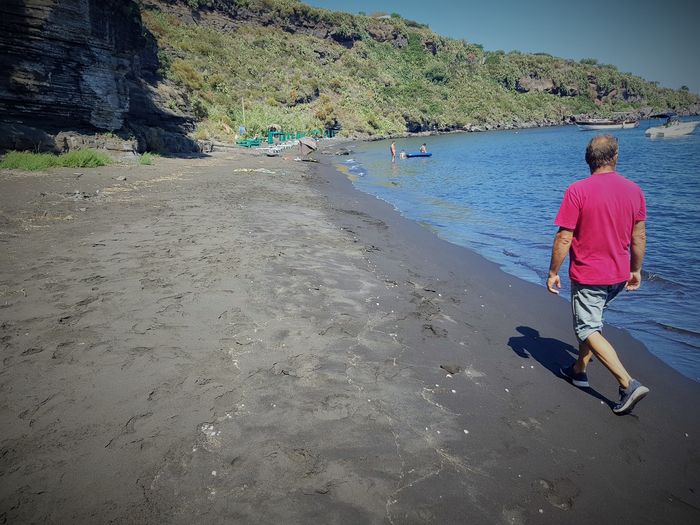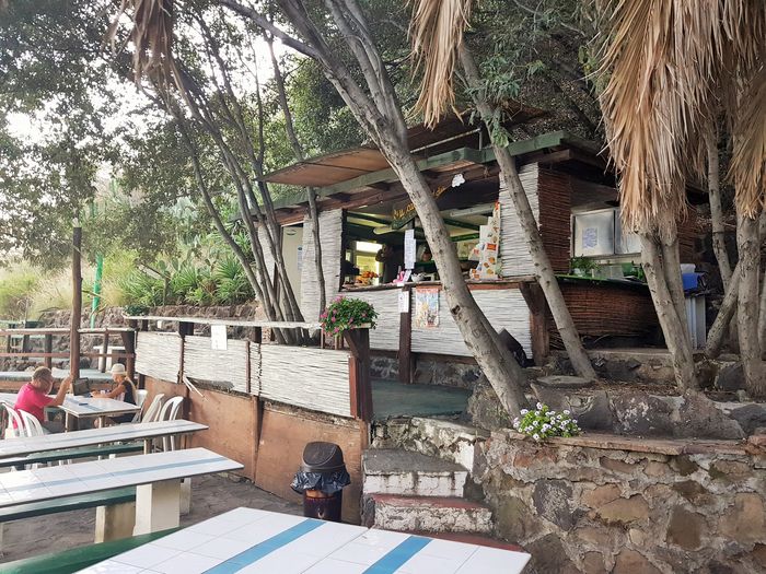Ingen skällde på oss när vi drog upp jollen i bortre ändan av stranden. Vi promenerade i den finkorniga kolsvarta sanden och vi fann under de stora träden i slänten en hydda. Ett hus vore nog för avancerat att kalla byggnaden. Med bardisk och enkel meny och några enkla bord utanför så hälsade en glad italienare på oss. Ägaren till stranden och restaurangen. Han skulle strax stänga för dagen men vi var välkomna åter nästkommande dag.