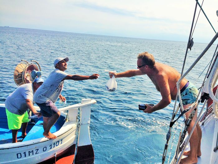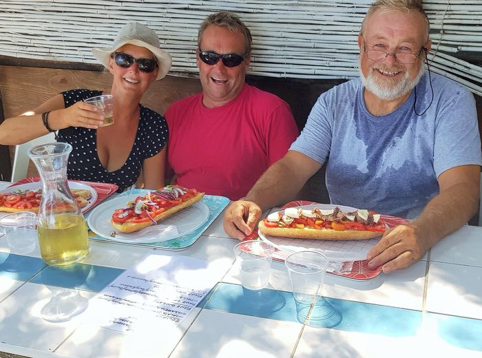 Dagen därpå var vi tillbaka. Vi gick upp till restaurangen och där slog vi oss ner. Vi beställde paninis med öns delikatesser. Färska tomater i överflöd och färsk basilika, röd lök, oliver, tonfisk, kapris och mozzarella. Allt lagt på ett nybakt bröd i sin enkelhet. Det smakade fantastiskt, fina råvaror gör skillnaden. En flaska Aqua Minerale och en karaff med bondens och tillika restaurangägarens egna vin. Ett friskt vitt naturvin med snälla tanniner. Utsikten var bedårande. Framför oss i bukten låg våra segelbåtar i solskenet och i horisonten anade vi konturerna av Sicilien.