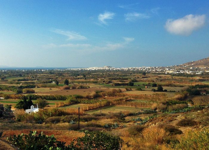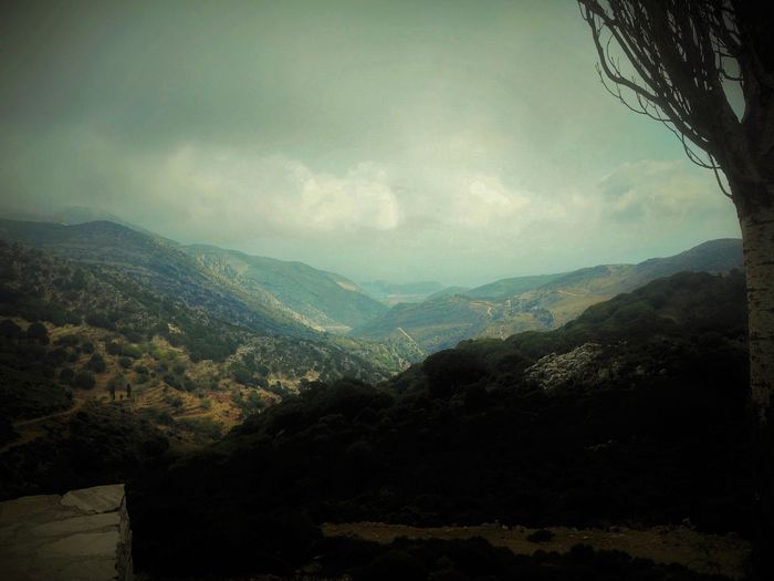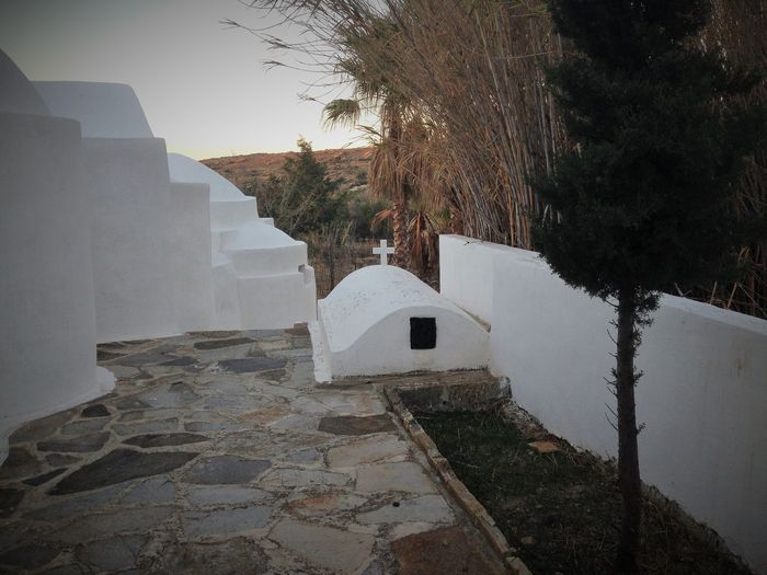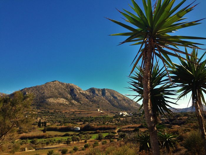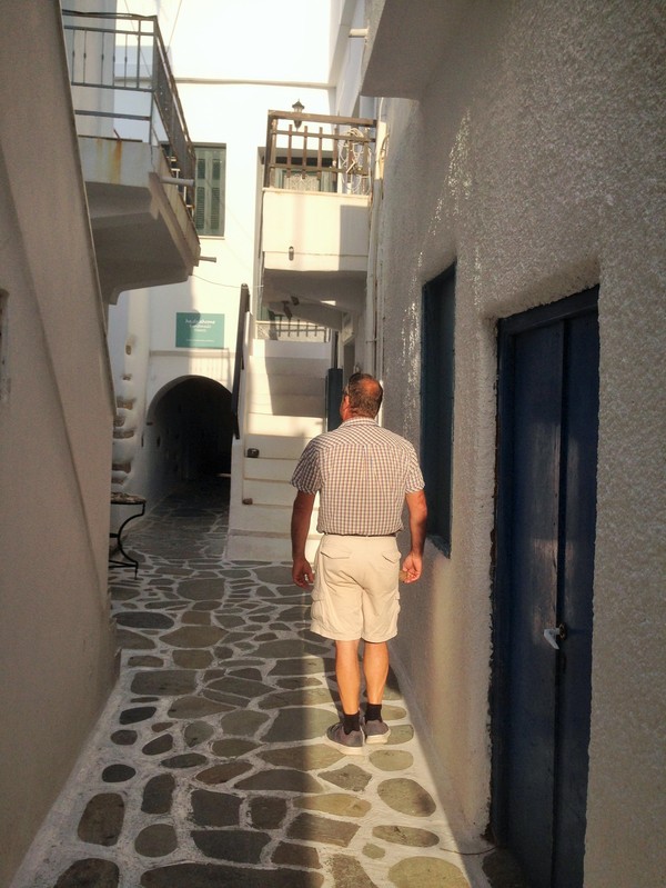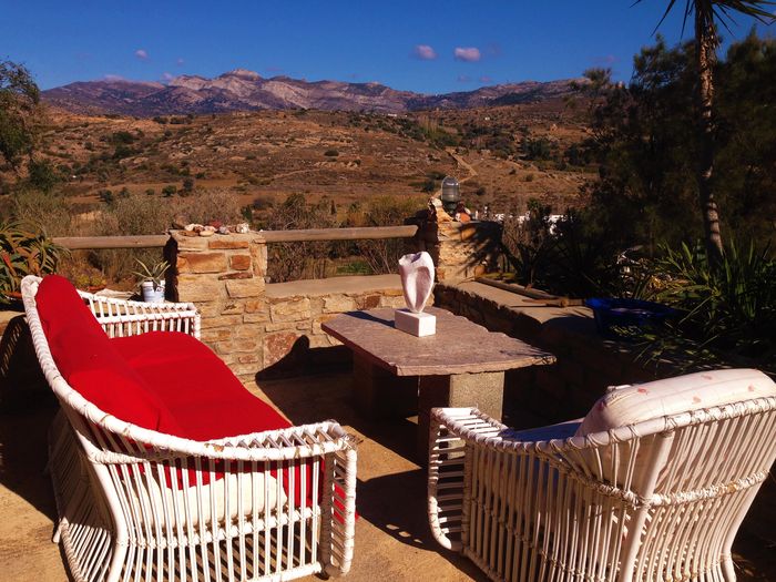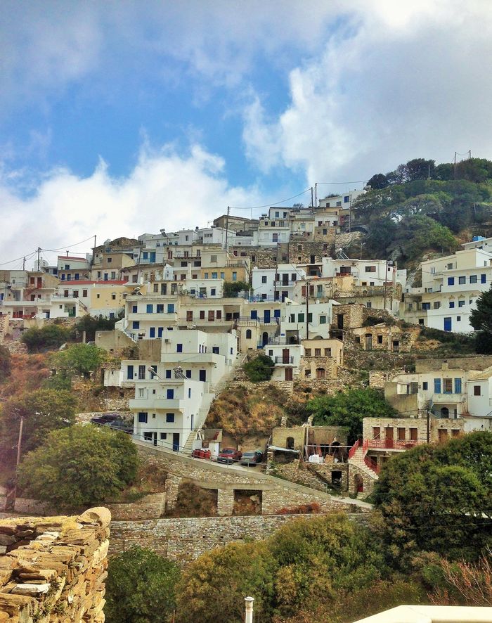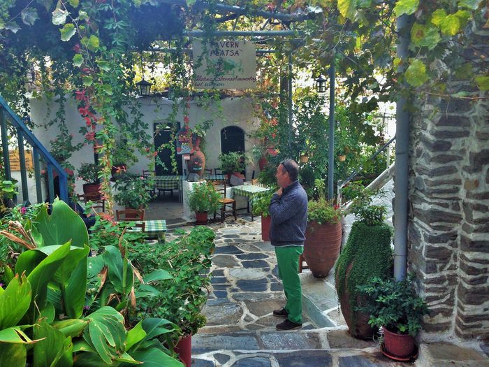 Vi hoppade in i bilen och vi fick oss en vacker tur över krön och genom dalar. Så småningom så bredde den vackraste naturscenen ut framför oss och där, vid foten av öns högsta berg (Zas/Zeus och Kykladernas högsta bergstopp, 1004 m.ö.h) så bodde de i ett typiskt grekiskt hus. Sockerbitsformat med rundade kanter och fönsterluckor. Uppe i bergen så är det alltid en 3-4 grader svalare än nere i byn. Vi hade garderat oss med en extratröja.