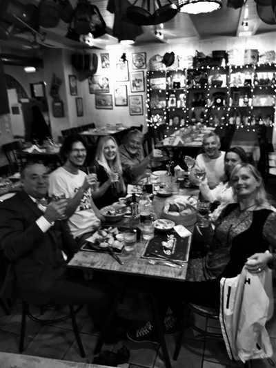 När klockan var tio, två timmar kvar till tolvslaget så syntes ännu inga andra gäster. Och det var inte en tillstymmelse till något musikaliskt band (inget omusikaliskt heller för den delen). Servitören hade i förbigående dryftat något om klockan elva… Vi glömde med tiden av att det skulle spelas musik, för maten lät sig njutas och drycken med rus fick oss att prata högt med yviga gester likt tvättäkta sydeuropéer.