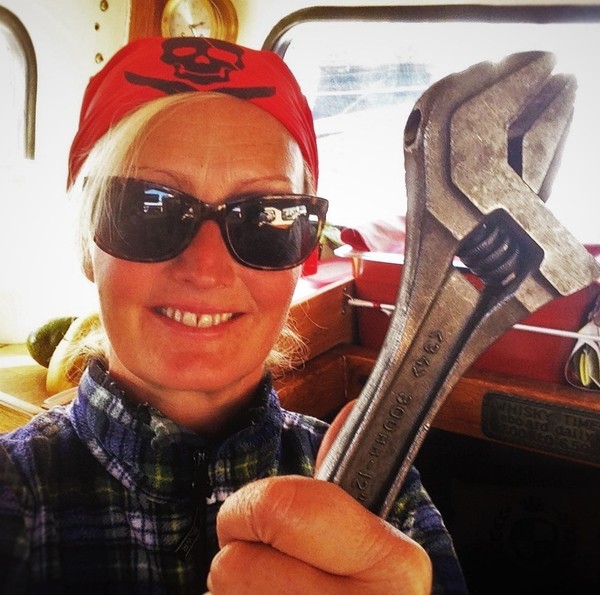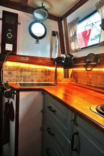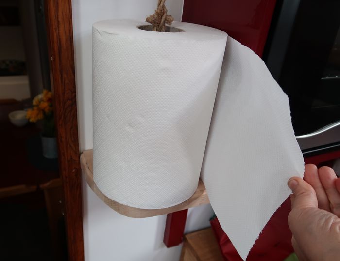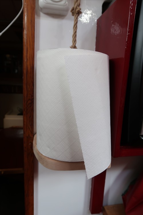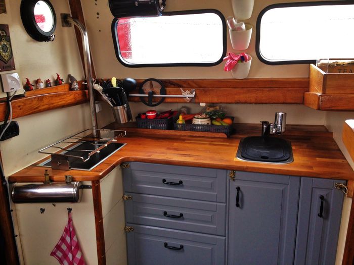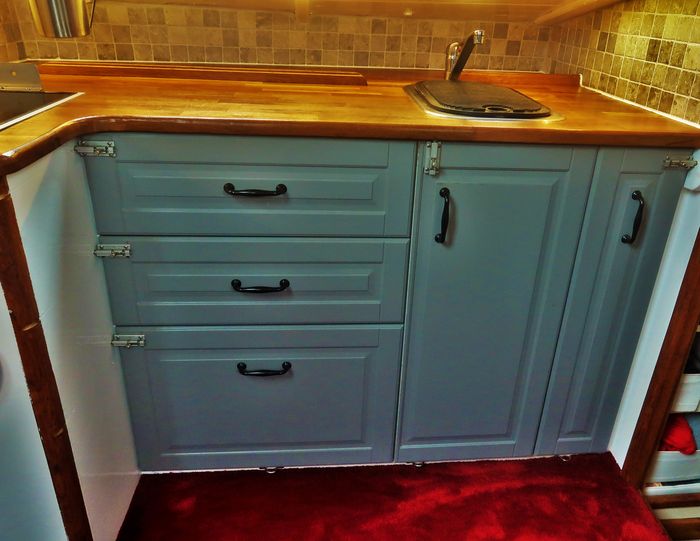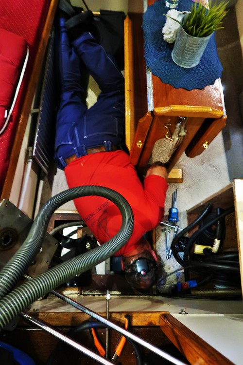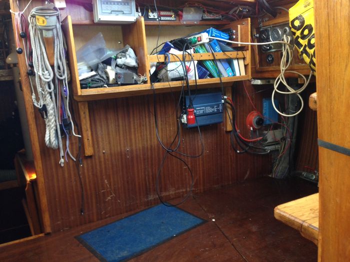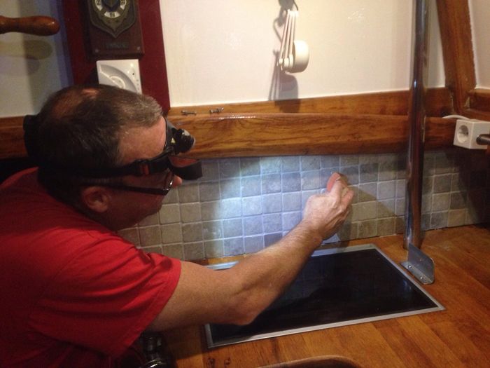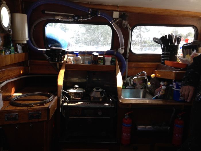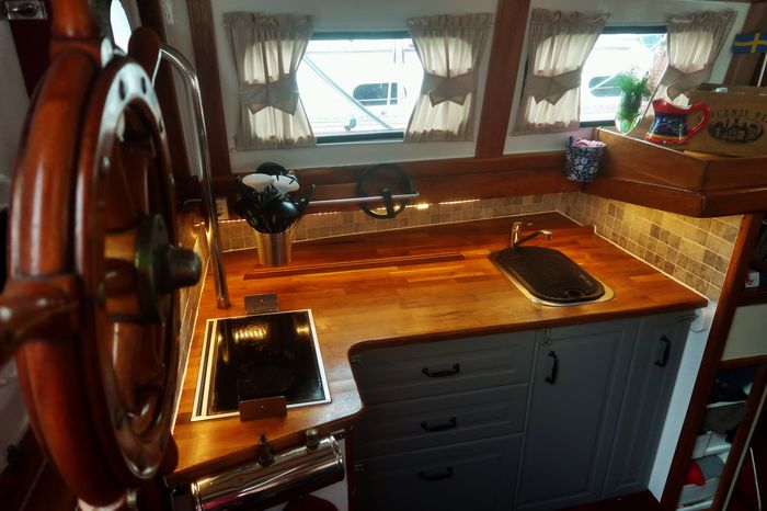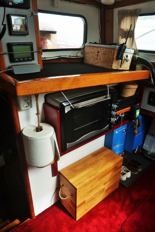 Byssan har nu fått nytt kakel, gardiner, ny färg på väggar, skåpluckorna har fått nya spärrar, ny ugn, ny matta, täckskivor som döljer skruvskallarna på de genomgående bultarna till räcket som sitter på utsidan, bokhyllan mellan styrhytt och salong har kapats med såg och våld för att ugnen skulle få plats, en del nya elkontakter har sett dagens ljus, ny ledslinga med tillhörande fint arbetsljus över kökbänken…ja och så skolådan och hyllan Hubert till hushållspappret, små praktiska ting som underlättar livet ombord.