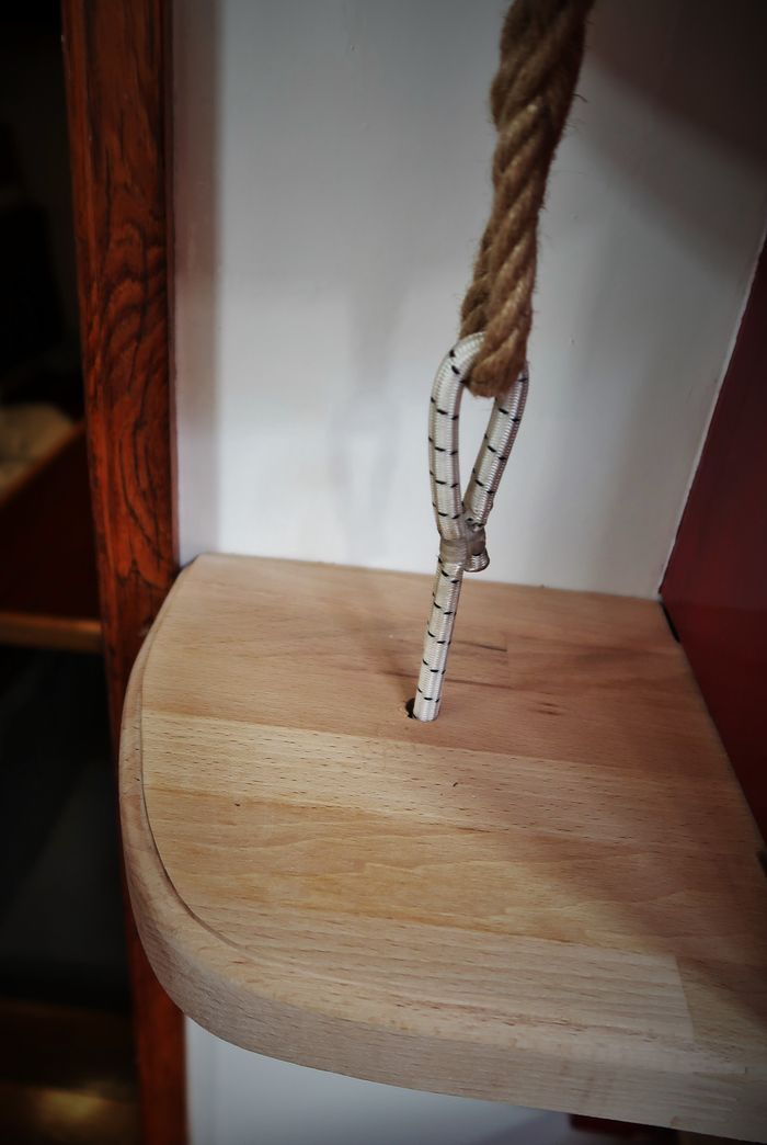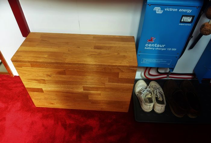 Först ut kommer styrhytten aka byssan. (ordet aka kommer från engelskan och står för ”also known as”) I styrhytten lufsar vi numera runt i en mjuk rojalistisk kärleksfärgad heltäckningsmatta. Den förra matten som var grå till färgen började smula något så förskräckligt på undersidan där gummit hade torkat. Den betedde sig som en smulpaj och det var något irriterande. Vi fick till och med smulorna ner på vår fina gula Vetusmotor som bor under golvet (läs; durken). Utbudet av mattor var inte riktigt som hemma där man finner ett brett sortiment även för mer tuffa utrymmen som ju faktiskt en båt är. Utbudet var betydligt mer begränsat här på Naxos och de mest praktiska mattorna var urtråkiga. Men då vi är rätt ordningsamma och tar av oss skorna så fort vi kommer in, så föll vi till slut för en fluffig sak som rimmar fint i färg med annat ombord. Det ska vara skönt och mjukt under fötterna.