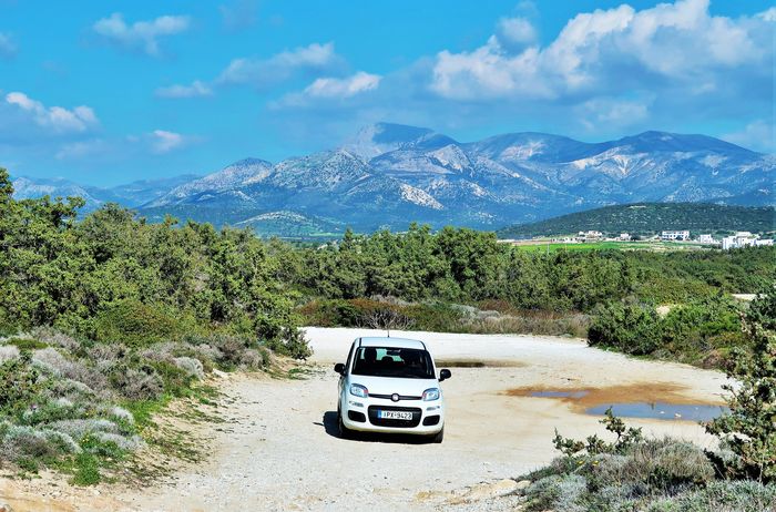 Blånande berg överallt i Grekland…här med vår lilla hyrda pärla med på bild…