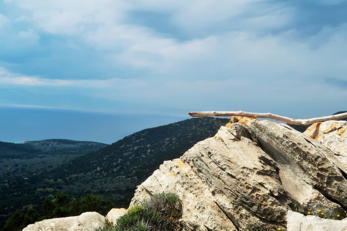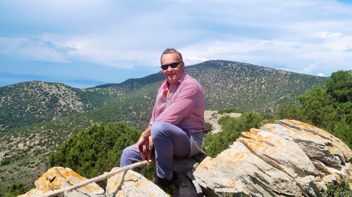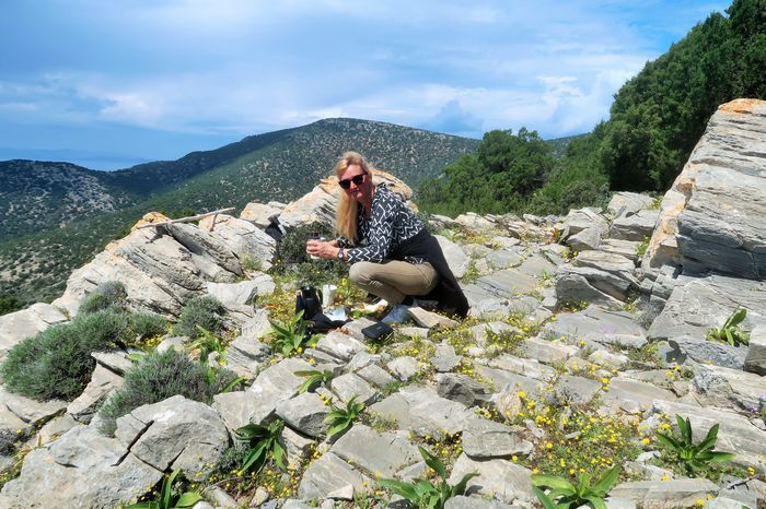 Uppe på berget blev det en välsmakande kopp kaffe med kaka. Det här är nog den vackraste utsikt vi hittills upplevt till en fika. Nedanför i viken kunde vi se Wilma i det turkosfärgade vattnet och himmel och hav möttes i de blåaste toner. I horisonten anades siluetten från någon avlägsen grekisk ö. Platsen är som hämtad ur en broschyr.